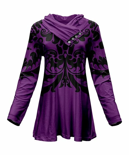 A high cowl neck with button details lends this patterned tunic a touch of chic style savvy.