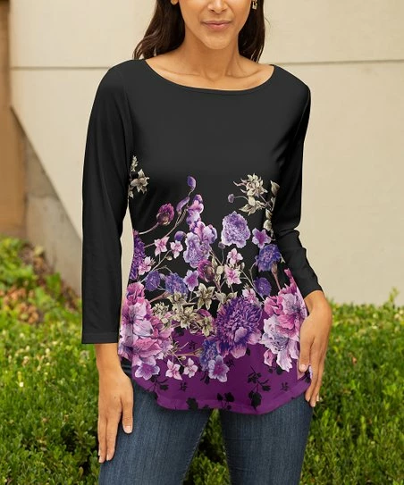 Lily | Purple & Black Floral Boatneck Top – Plus