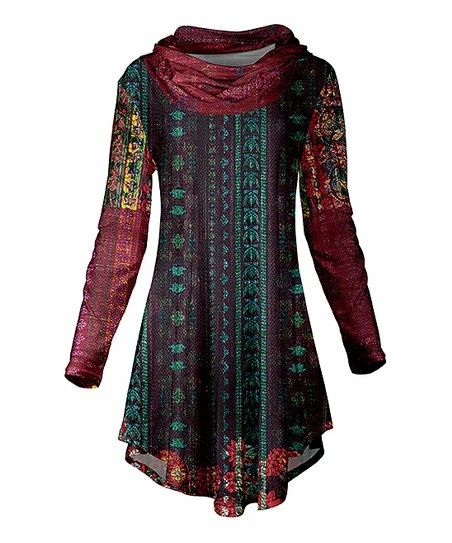 A playful, colorful print, cowl neckline and stretch-enhanced fabric lend flattering appeal to this flowy everyday tunic.