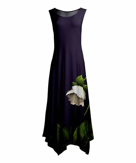 Express your bold and vibrant style in this sleeveless maxi dress featuring a head-turning print and a handkerchief-style hemline for breezy, flowing movement wherever you go.