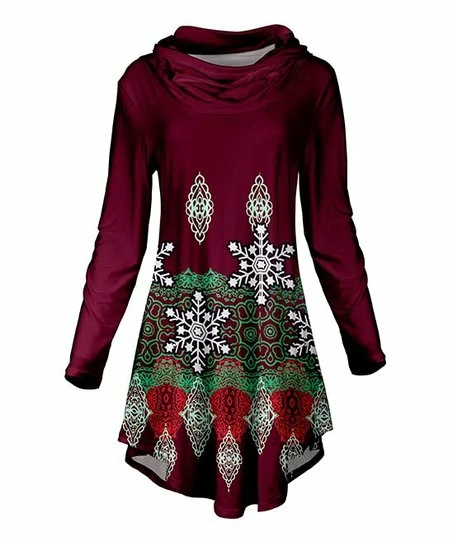 A draped cowl neckline and statement-making pattern elevate the look of this trendy tunic. Stretch-infused fabric and a flattering curved hem create a comfortable, leggings-friendly fit.