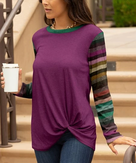 Upgrade your everyday-casual essentials with this stripe-sleeve tunic embellished with a classic crewneck and a twist-front detail for stylish flair.