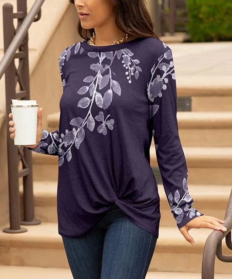 Lily | Purple & Lavender Branch Front-Twist Long-Sleeve Tunic – Women