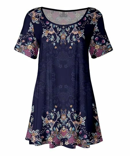 Take on sunny days by opting for this flared scoop neck tunic that displays a dramatic print while delivering the breezy comfort of short sleeves.