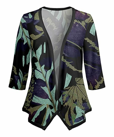 Add a polished finishing touch to your cool-weather looks with this lightweight open cardigan that features three-quarter sleeves, an angled hemline and a creative motif.
