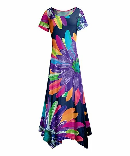 Get ready for your next special occasion with this vibrant floral maxi dress fashioned with a flowy handkerchief hem and a generous neckline for your favorite bauble.
