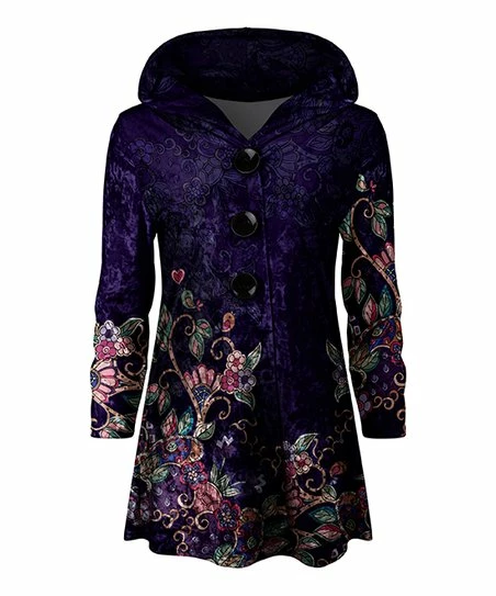 Cozy up in luxury when you pull on this velvet hooded tunic fashioned with a lengthy silhouette, half-button placket and a floral print.