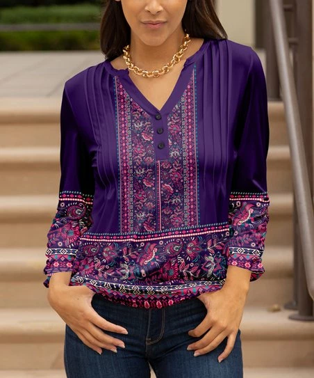 Lily | Purple & Pink Geometric Floral Pleated Button-Front Notch Neck Tunic – Plus