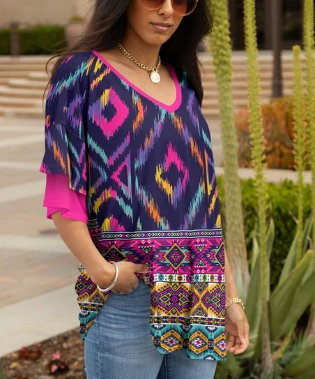 This flowy stretch tunic features contrasting ruffled sleeves and a bold print for added impact.
