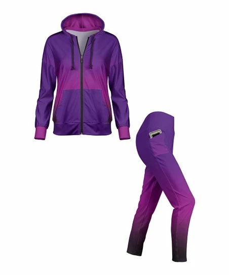Lightweight set features a zip-up, drawstring hoodie with front pockets and sleek leggings with a side pocket.