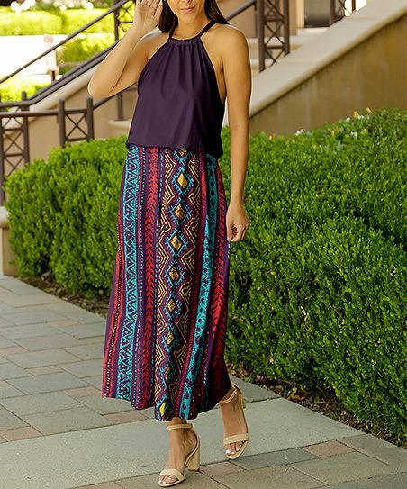Halter dress featuring comfortable stretch-infused fabric and a fun and flowy blouson design.