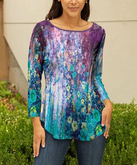 Lily | Purple & Turquoise Abstract Floral Boatneck Top – Women