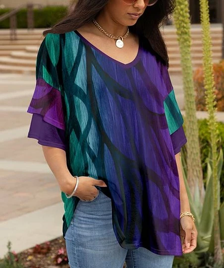 Ruffled sleeves put a romantic spin on this v-neck tunic that catches the eye with a bold print.