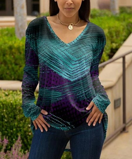 Update your casual ensembles with a pop of pizzazz by donning this versatile v-neck tunic crafted from stretch-blend fabric and showcasing an abstract print.