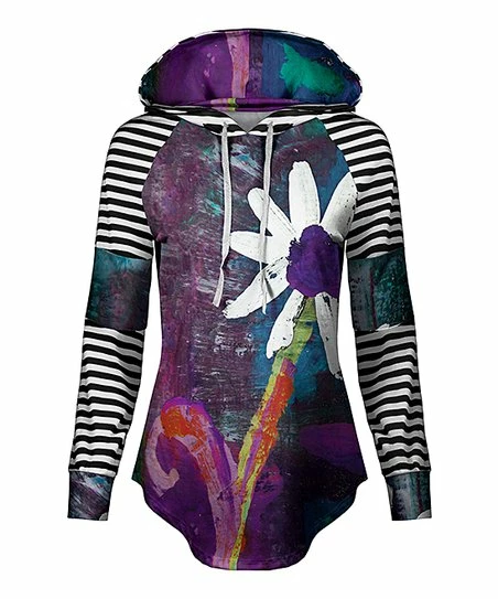 A swingy curved hem adds a flattering detail to this long-sleeve hoodie defined by a unique print.