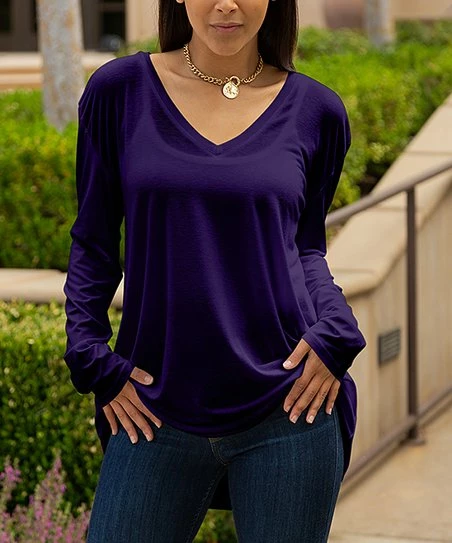 Cozy comfort and versatile style combine in the design of this solid-colored tunic that features a v-neck and long sleeves.