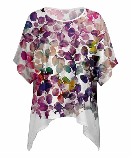 Light, stretch-infused tunic featuring a colorful abstract print, dramatic dolman sleeves and sidetail accents.