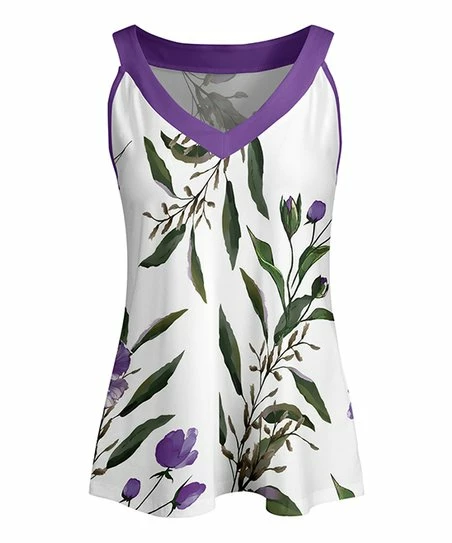Lily | Purple & White Floral Leaves V-Neck Tank – Women