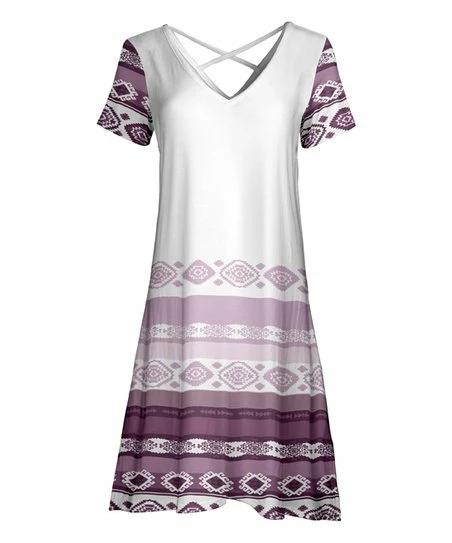 Crisscrossing straps add an intriguing detail to this short-sleeved dress. The soft, stretchy fabric will keep you comfy all day long, and the vivid print gives the piece fun flair.
