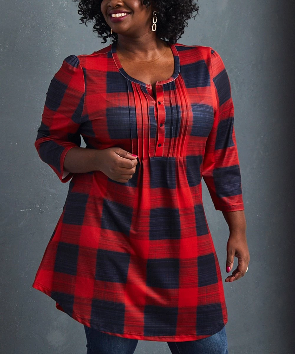 Button into bold bliss with this tunic featuring a half-length button placket and swingy curved hem.