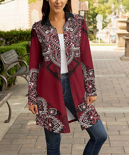 This longline shacket features a classic button-up closure and stretchy, lightweight fabric.