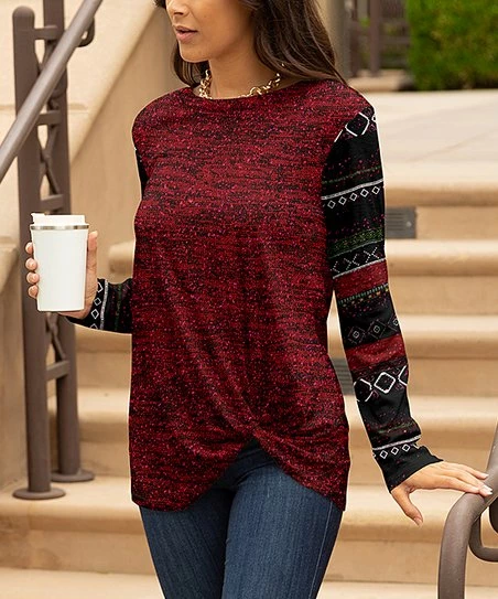 Give your casual looks a fun twist with this patterned tunic charmed with a knotted hemline and cozy long-sleeves.