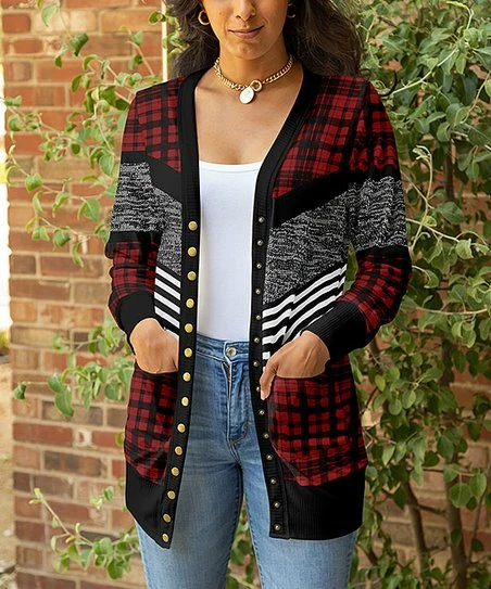 Lily | Red & Black Plaid Block Button-Up Cardigan – Plus