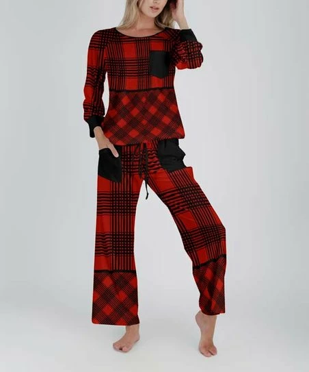 - Includes red and black plaid long-sleeve pocket top and red and black plaid lounge pants (two pieces total)