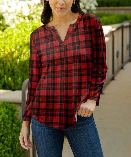 Fall for this v-neck top featuring a bold pattern, curved hem and stretchy fabric.