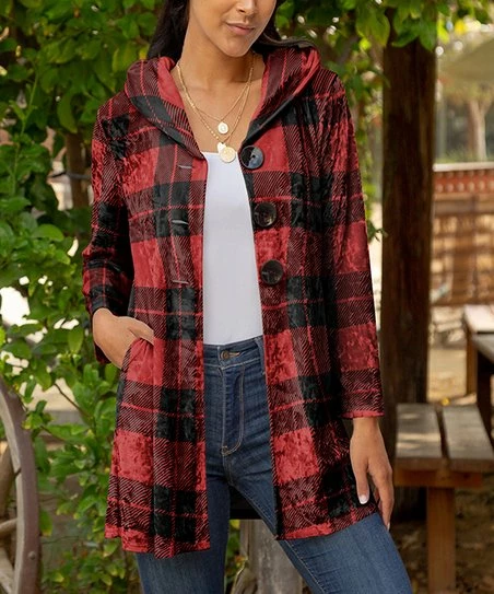 Top off your look with this longline button-up cardigan featuring luxe velvet material and a cozy hood and side pockets.