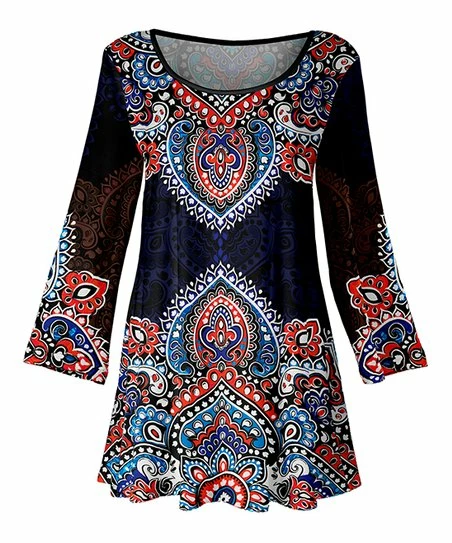 Make a statement in this bold print tunic boasting a flowy design with lightweight stretch-blend material and charming bell sleeves to complete the look.