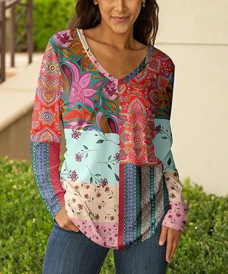 This tunic features a V-shaped neckline and floral motif. Crafted from a stretch blend for flexible comfort.