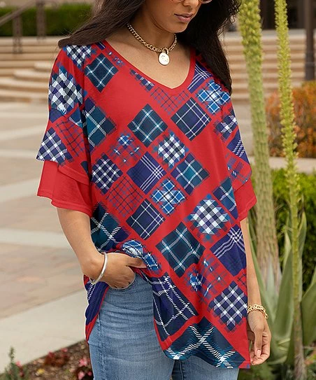 With layered bell-sleeves and a v-neck collars, this lightweight tunic adds color and comfort to your warm weather wardrobe.