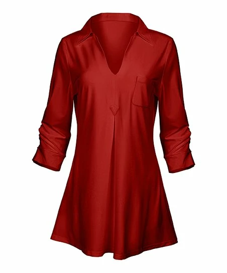 Elevate your everyday look with this stretchy tunic featuring a flared fit and a solid hue. A crisp collar and a classic v-neck bring the look to a sophisticated finish.