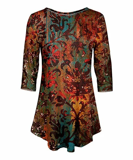 A curved hem and three-quarter-length sleeves add sweet appeal to this colorful tunic. Stretch-enhanced fabric feels soft against your skin.
