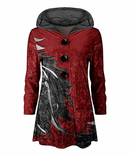 Style up your weekend jaunts with this fluid hooded tunic boasting prominent front buttons and a statement print.