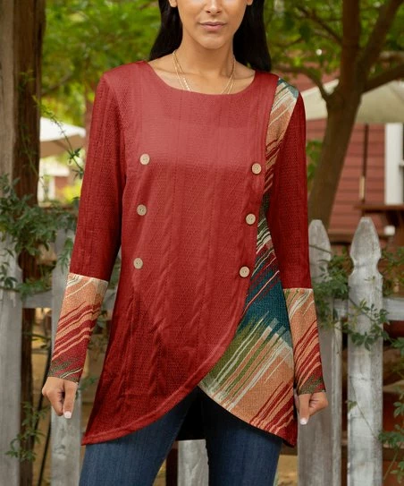 This long-sleeve top features a double-breasted button design that flows into a tulip hem.
