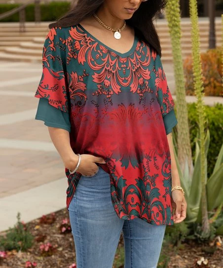 Take on the day in this loose-fit tunic featuring ruffled sleeves and a v-neck.