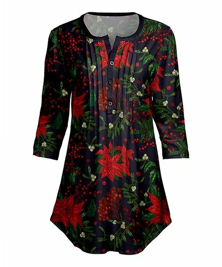 This flowy tunic features a button detail, a notch neck, a comfortable stretch-infused fabric, and pleating down the chest.