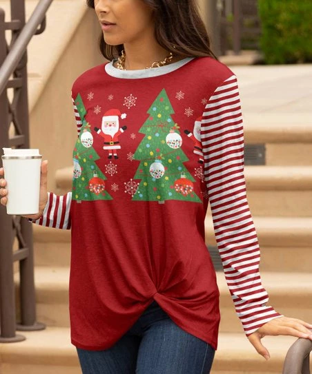 A twist detail at the hem adds flirty detail to this bold-patterned tunic enhanced with cozy long sleeves and a hint of stretch for a flexible fit.