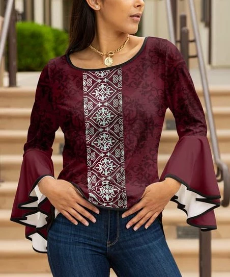 This fashionable tunic combines retro-cool style with a bold pattern and ruffled bell sleeves for tons of movement.