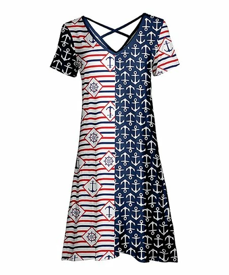 Enliven your casual wardrobe with this short-sleeve A-line dress that features a strappy v-back and a nautical print.