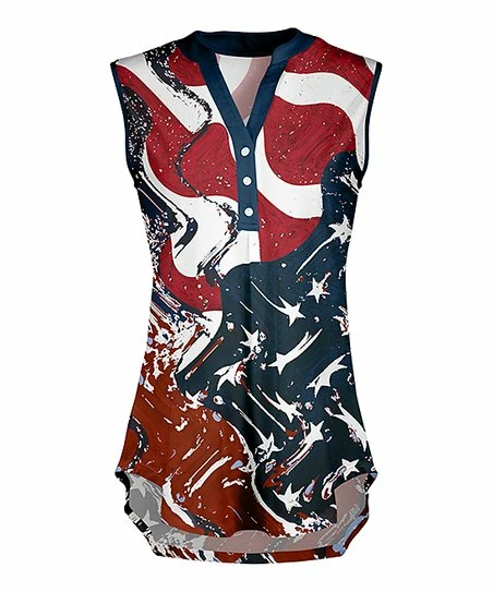 Beat the heat in standout style wearing this boldly patterned tunic that features a sleeveless design and get-noticed print. Buttons liven up the v-neck, and a dolphin hem brings it to a curvy conclusion.