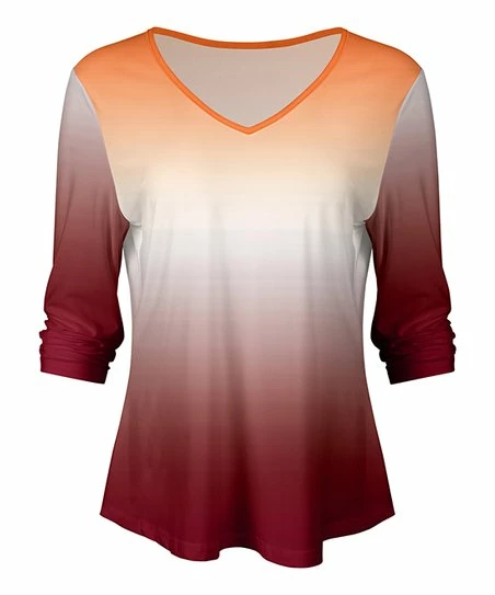 Face shifting temps in artsy fashion wearing this v-neck tee that readies you for the weather with stretchy fabric and three-quarter sleeves.