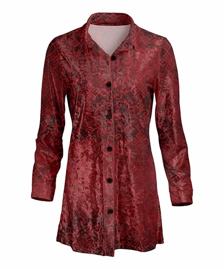 Elevate your everyday look with this long-sleeve tunic sporting plush velvet fabric and a button-up silhouette for adjustable coverage.