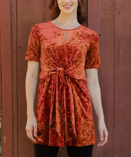 This soft, velvet top features a wide tie-waist, and a keyhole at the neckline adds a pop of intrigue.