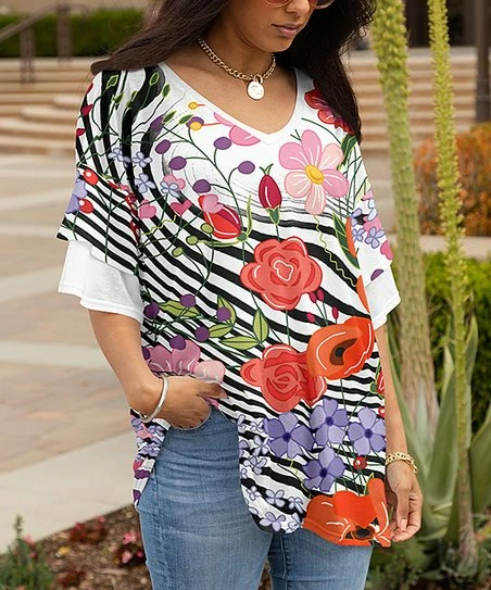 Light, stretch-friendly tunic featuring a colorful floral print and plunging v-neckline.