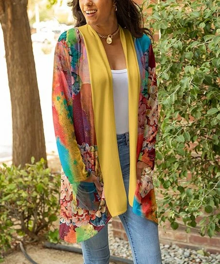 Update your look by layering this open cardigan over any outfit and add a pop of color and print with handy pockets and just the right amount of stretch for all-day enjoyment.