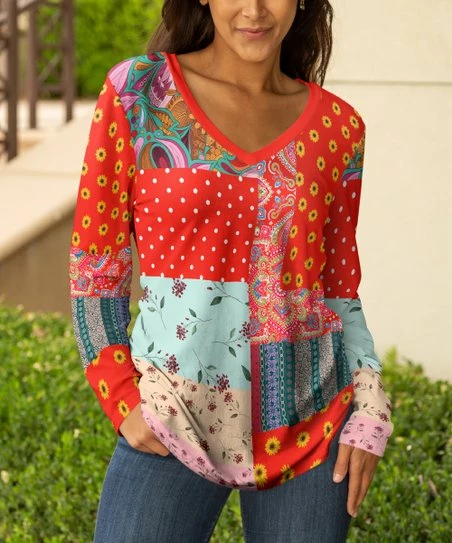 Lily | Red & Yellow Floral Patchwork V-Neck Tunic – Women