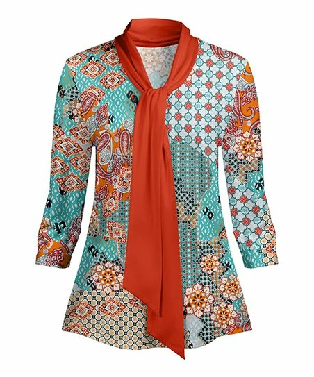 Lily | Rust & Aqua Geometric Floral Tie-Neck Three Quarter-Sleeve Tunic – Women & Plus